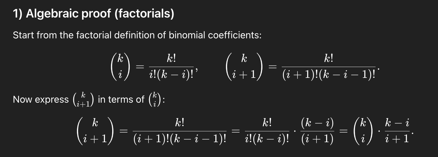 # next binomial coefficient: C(k, i+1) = C(k, i) * (k - i) / (i + 1)