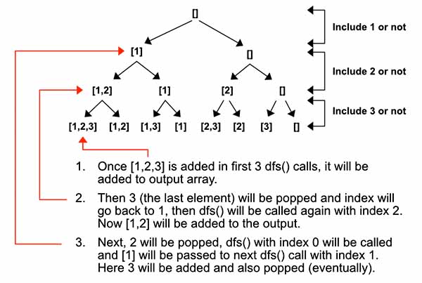 | 20 | dfs(3, [1,3]) | 3 | [1,3] | append [1,3] → [[], [3], [2], [2,3], [1], [1,3]] |